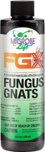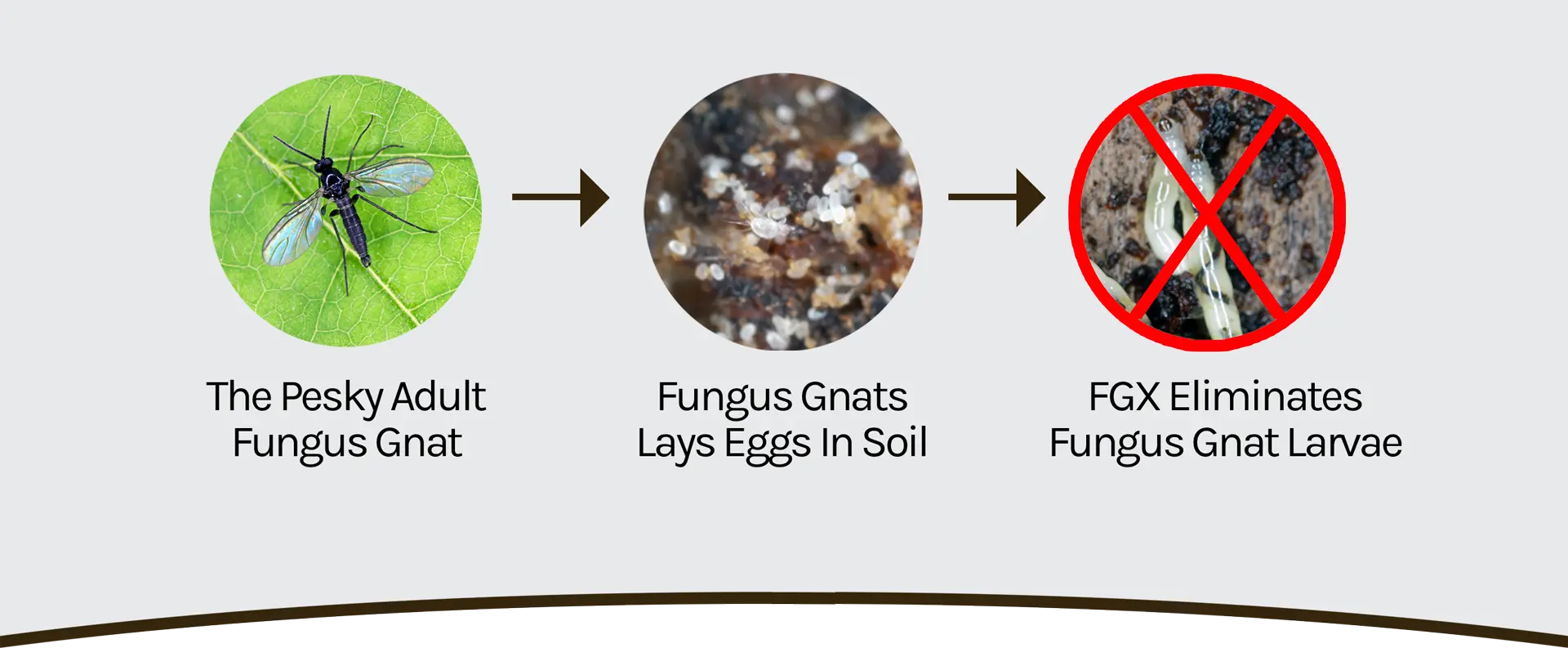 A. FGX uses Bacillus thuringiensis israelensis (BTi), a natural soil microbe that targets fungus gnat larvae. When larvae ingest it, they stop feeding and die. This breaks the gnat life cycle at the source.
